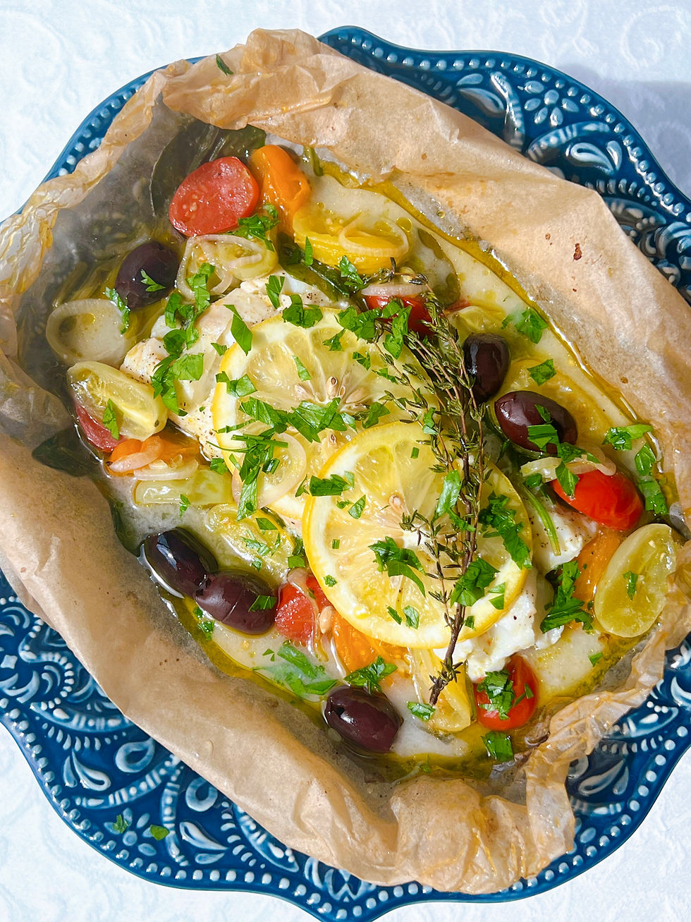 クッキングシートで包み込んだらオーブンで15分焼く。イタリアンパセリをトッピングして完成